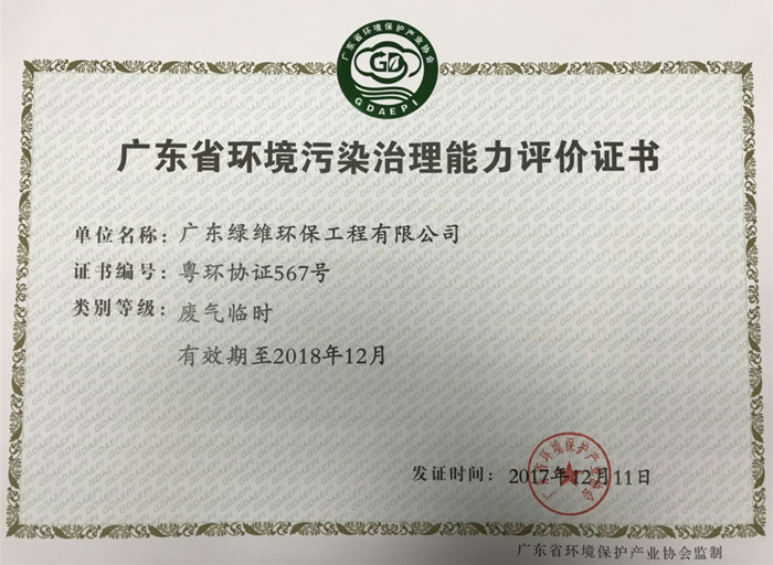 恭喜廣東綠維環(huán)保公司榮獲廣東省環(huán)境污染治理能力評(píng)價(jià)證書(shū)