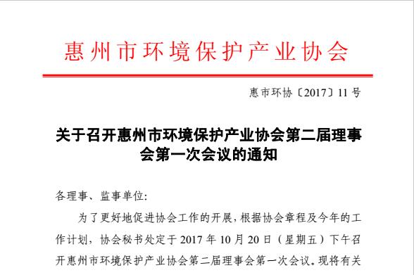 為了更好地促進協(xié)會工作的開展,根據(jù)協(xié)會章程及今年的工 作計劃,協(xié)會秘書處定于 2017 年 10 月 20 日(星期五)下午召開惠州市環(huán)境保護產(chǎn)業(yè)協(xié)會第二屆理事會第一次會議。廣東綠維環(huán)保工程有限公司應邀參加。