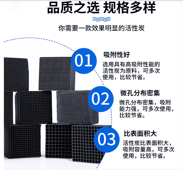 蜂窩活性炭具有比較面積大,通孔阻力小,微孔發(fā)達(dá),高吸附容量,使用壽命長(zhǎng)等特點(diǎn),在空氣污染治理中普遍應(yīng)用。選用蜂窩活性炭吸附法,即廢氣與具有大表面的多孔性活性炭接觸,廢氣中的污染物被吸附分解,從而起到凈化作用。