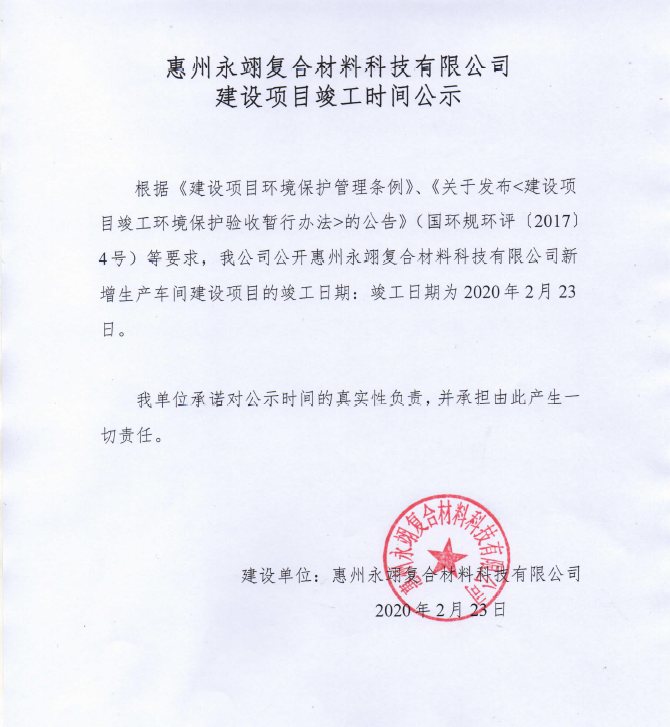 惠州永翊復(fù)合材料科技有限公司建設(shè)項(xiàng)目竣工時(shí)間公示