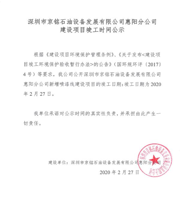 深圳市京銘石油設(shè)備發(fā)展有限公司惠陽(yáng)分公司建設(shè)項(xiàng)目竣工時(shí)間公示