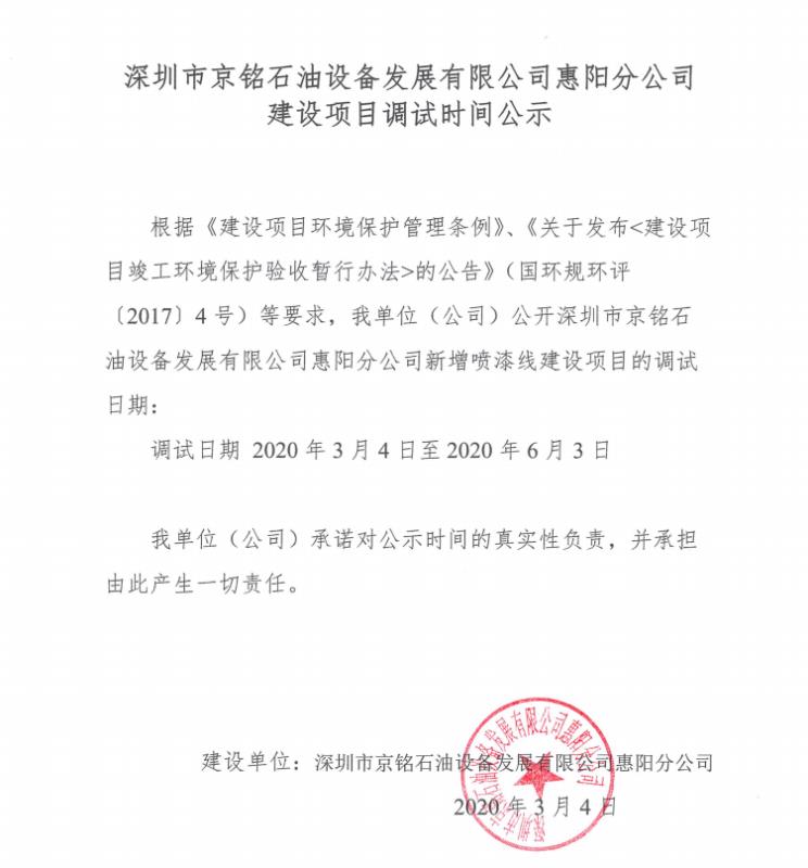 深圳市京銘石油設(shè)備發(fā)展有限公司惠陽(yáng)分公司建設(shè)項(xiàng)目調(diào)試時(shí)間公示