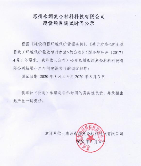 惠州永翊復(fù)合材料科技有限公司建設(shè)項(xiàng)目調(diào)試時(shí)間公示