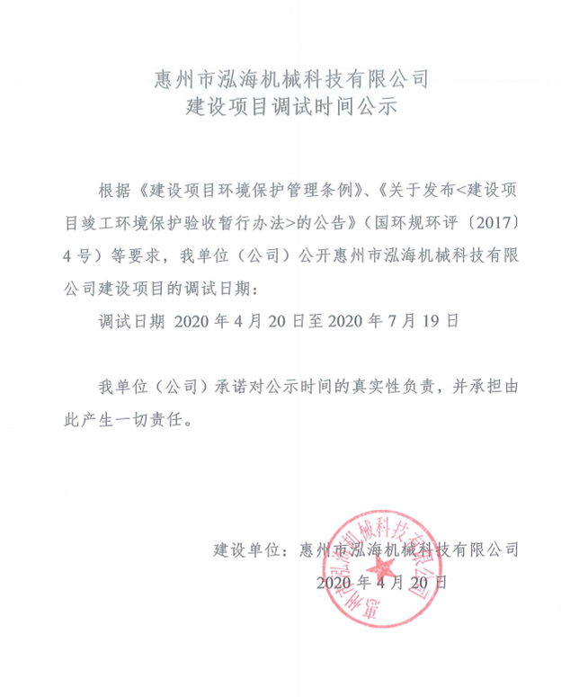 惠州市泓海機(jī)械科技有限公司建設(shè)項(xiàng)目調(diào)試時(shí)間公示