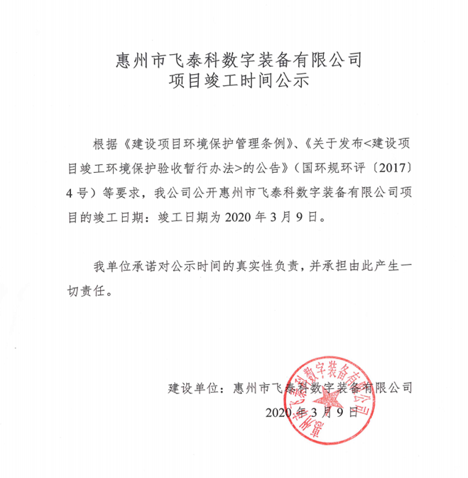 惠州市飛泰科數(shù)字裝備有限公司項(xiàng)目竣工時(shí)間公示