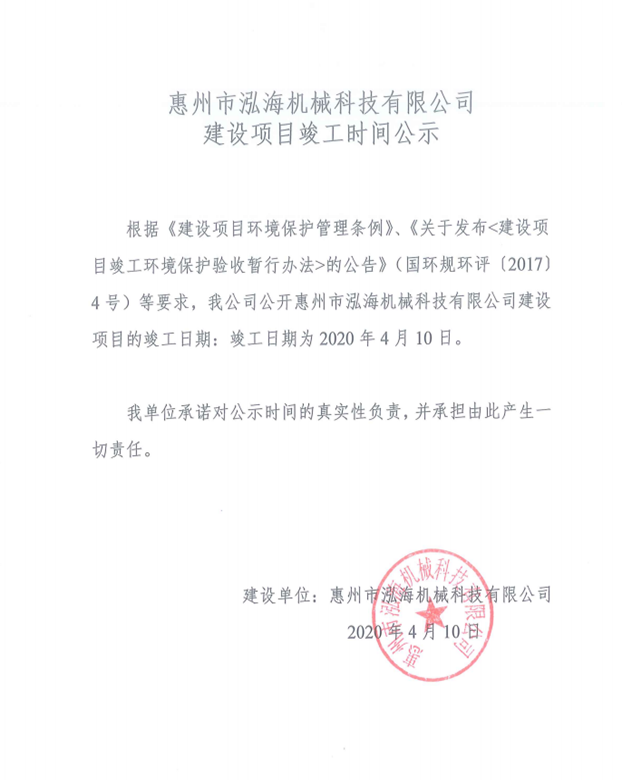 惠州市泓海機(jī)械科技有限公司建設(shè)項(xiàng)目竣工時(shí)間公示