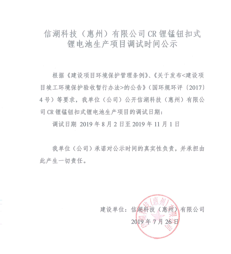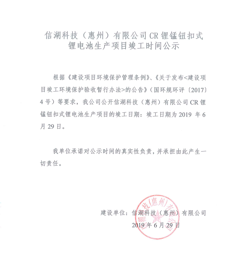 信湖科技(惠州)有限公司建設(shè)項目竣工環(huán)境保護驗收報告公示