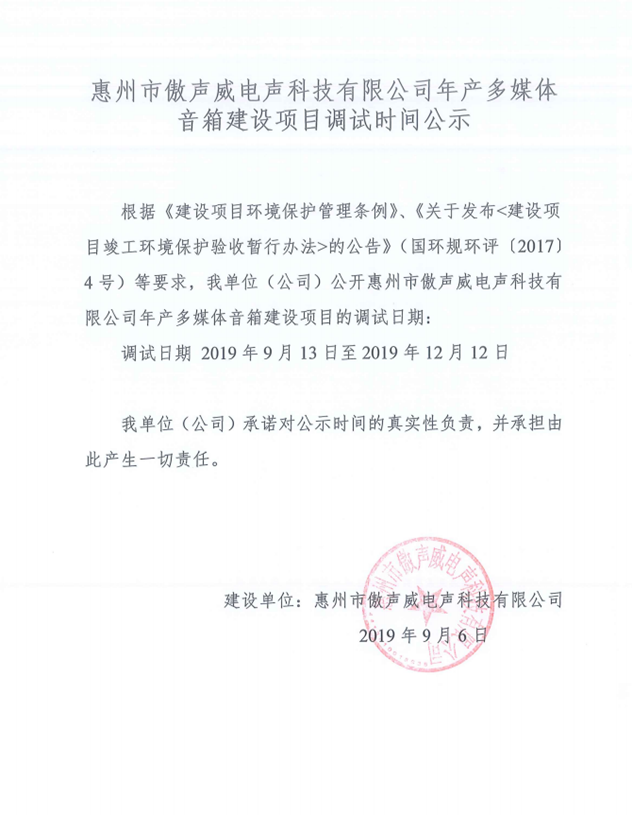 惠州市傲聲威電聲科技有限公司年產(chǎn)多媒體音箱建設(shè)項目調(diào)試時間公示
