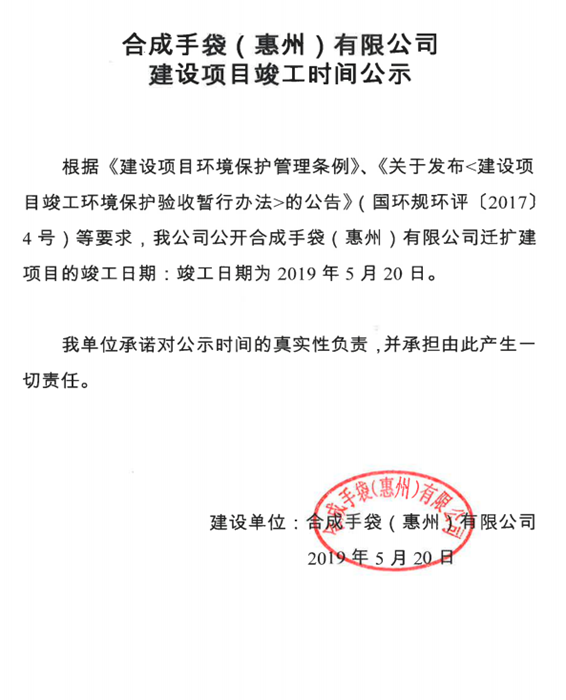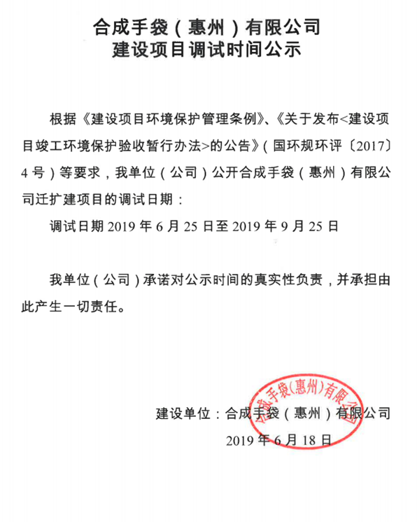 合成手袋(惠州)有限公司建設(shè)項目調(diào)試時間公示