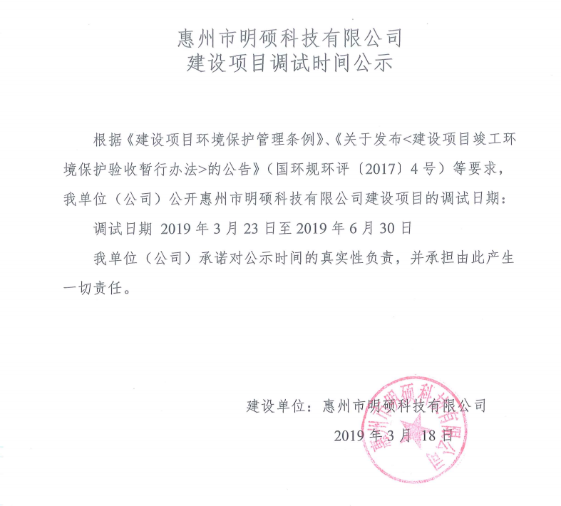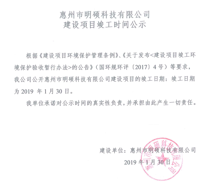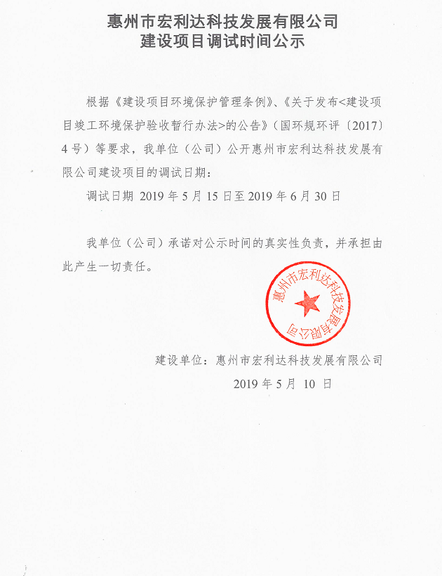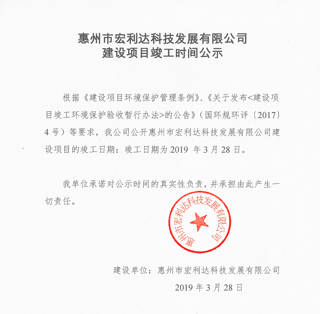 惠州市宏利達(dá)科技發(fā)展有限公司建設(shè)項(xiàng)目竣工時(shí)間公示