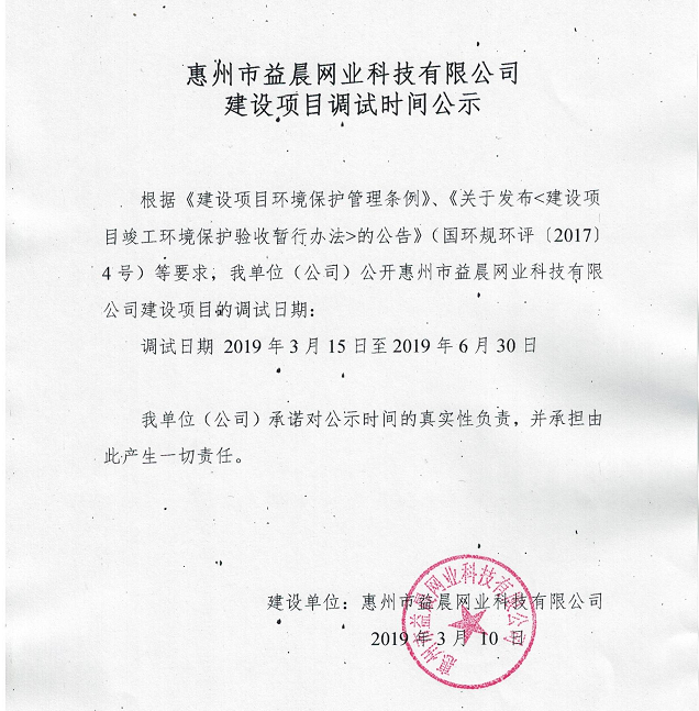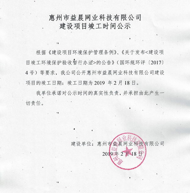 惠州市益晨網(wǎng)業(yè)科技有限公司建設(shè)項(xiàng)目竣工時(shí)間公示