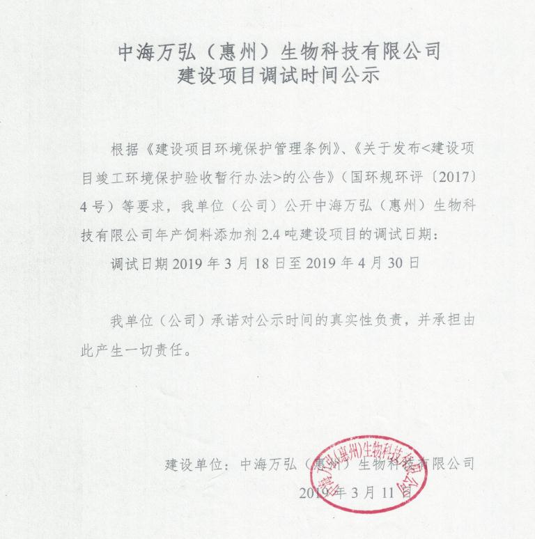中海萬(wàn)弘(惠州)生物科技有限公司建設(shè)項(xiàng)目竣工環(huán)境保護(hù)驗(yàn)收?qǐng)?bào)告公示