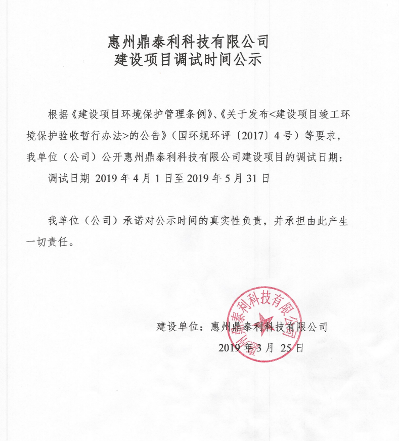 惠州鼎泰利科技有限公司 建設(shè)項(xiàng)目竣工環(huán)境保護(hù)驗(yàn)收?qǐng)?bào)告公示