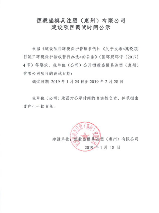 恒毅盛模具注塑(惠州)有限公司項(xiàng)目竣工環(huán)境保護(hù)驗(yàn)收報告公示
