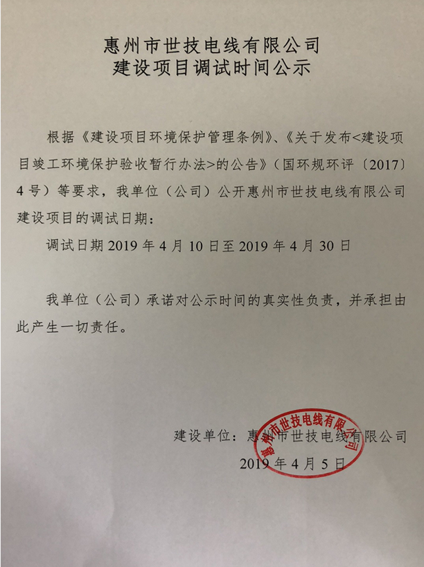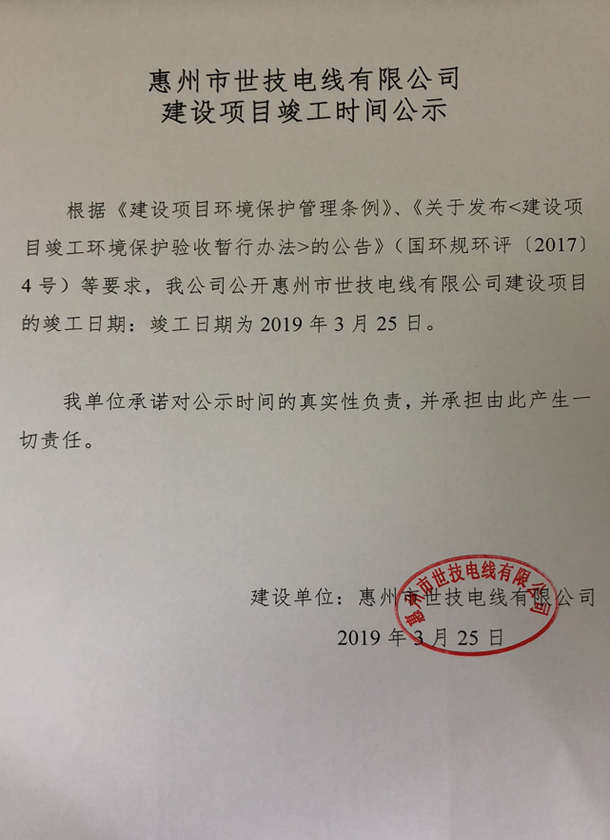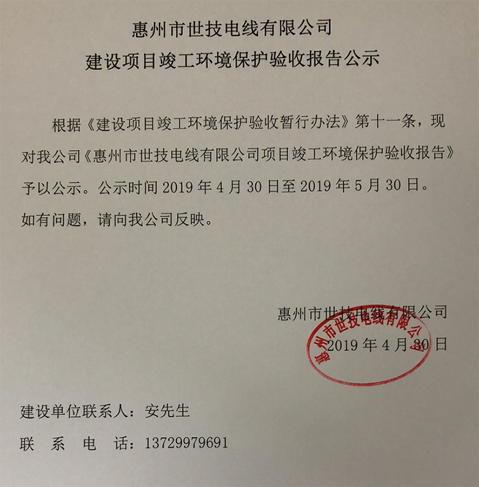 惠州市世技電線有限公司建設(shè)項(xiàng)目竣工環(huán)境保護(hù)驗(yàn)收報告公示