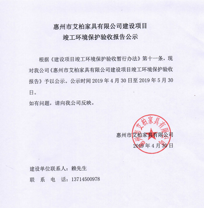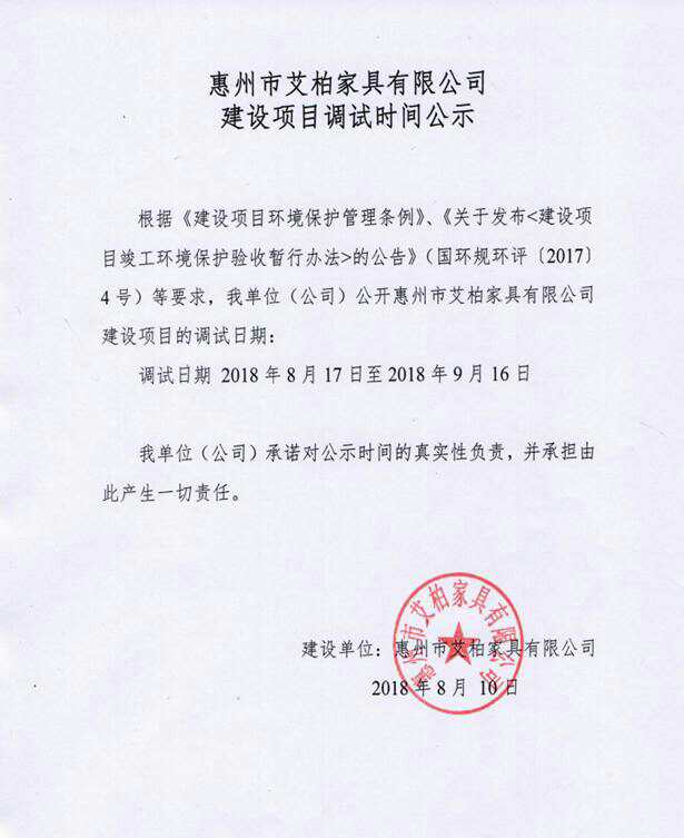惠州市艾柏家具有限公司建設(shè)項(xiàng)目調(diào)試時間公示