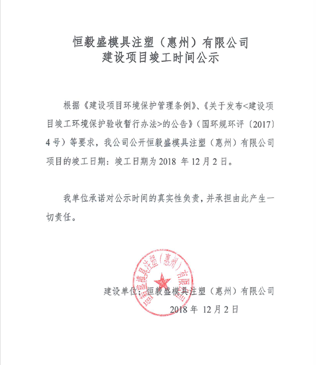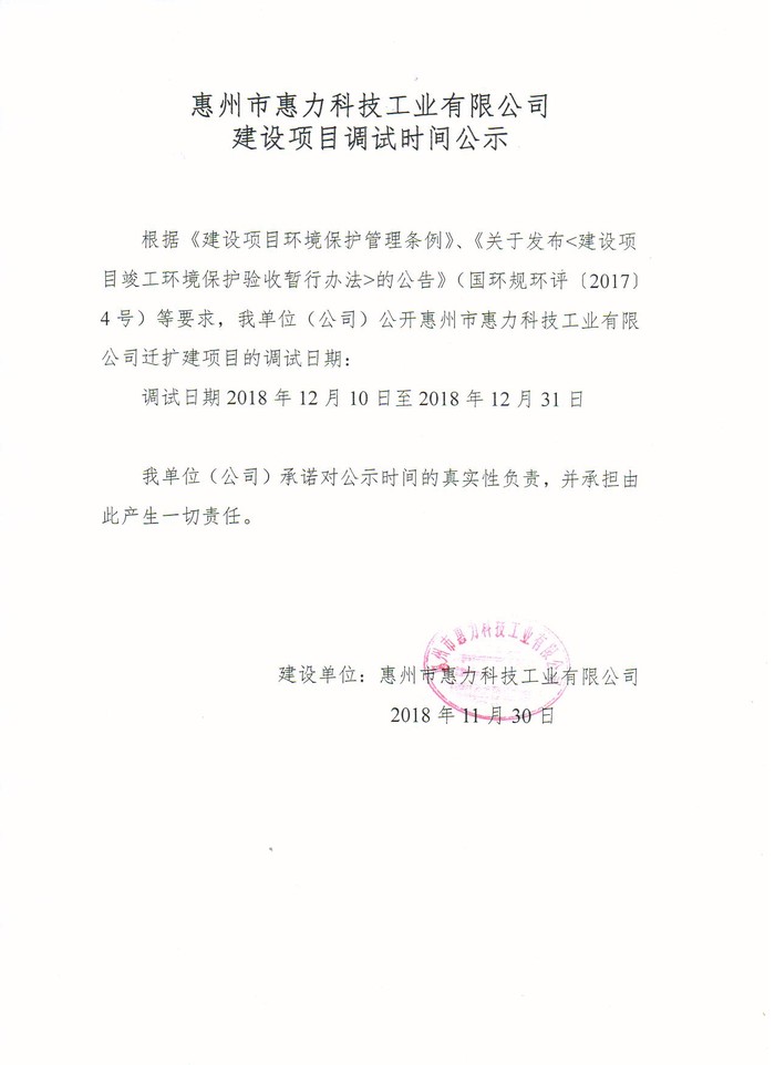 惠州市惠力科技工業(yè)有限公司建設(shè)項目竣工時間公示