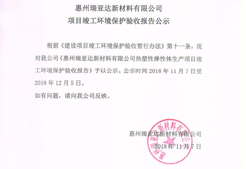 惠州瑞亞達(dá)新材料有限公司項(xiàng)目竣工環(huán)境保護(hù)驗(yàn)收?qǐng)?bào)告公示