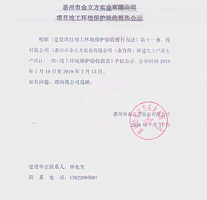 惠州市金立方實(shí)業(yè)有限公司項(xiàng)目竣工環(huán)境保護(hù)驗(yàn)收?qǐng)?bào)告公示