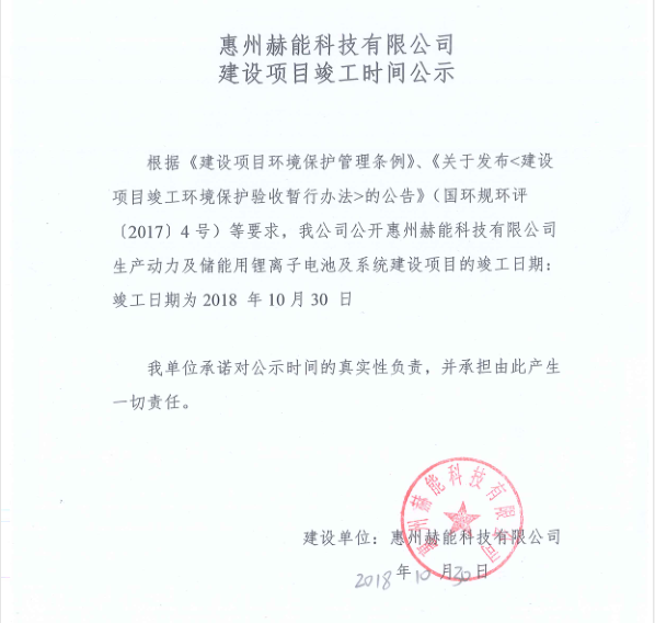 惠州赫能科技有限公司建設(shè)項(xiàng)目竣工時(shí)間公示