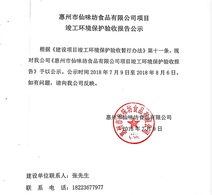 惠州市仙味坊食品有限公司項目竣工環(huán)境保護(hù)驗收報告公示