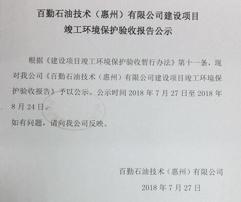 百勤石油技術(shù)(惠州)有限公司建設(shè)項目竣工環(huán)境保護(hù)驗收報告公示