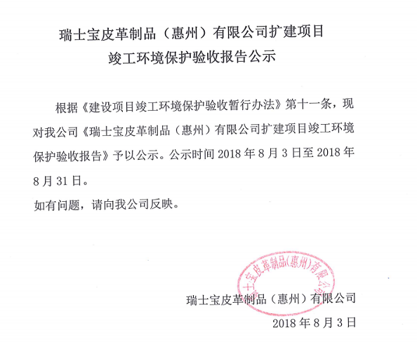 瑞士寶皮革制品(惠州)有限公司擴(kuò)建項目竣工環(huán)境保護(hù)驗收報告公示