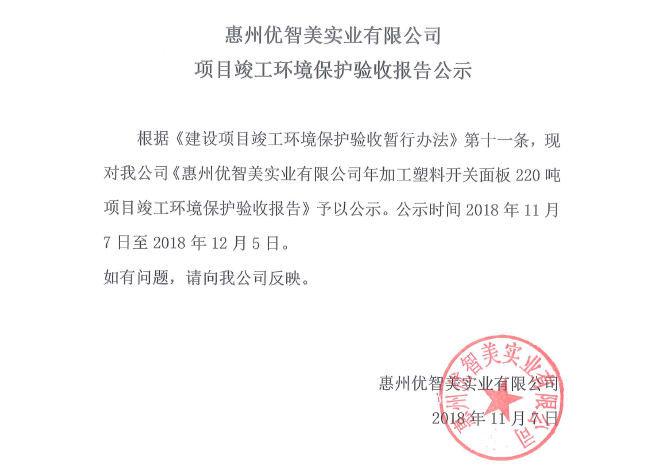 惠州優(yōu)智美實業(yè)有限公司項目竣工環(huán)境保護(hù)驗收報告公示