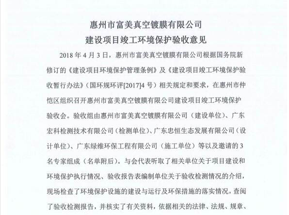 惠州市富美真空鍍膜有限公司建設(shè)項(xiàng)目竣工環(huán)境保護(hù)驗(yàn)收公示