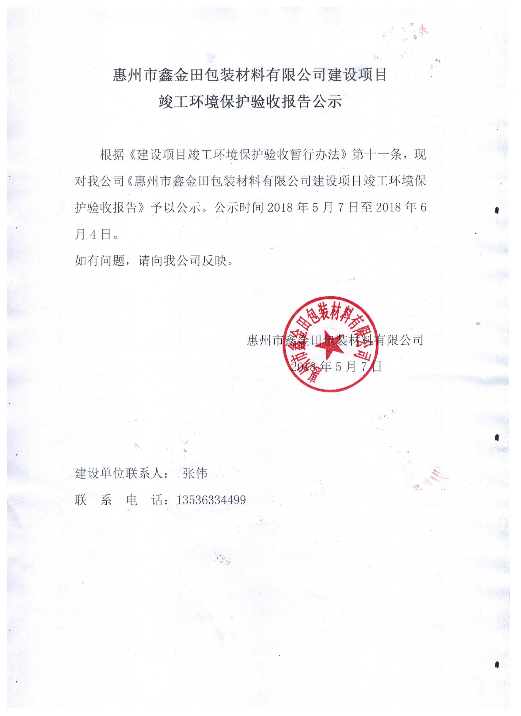 惠州市鑫金田包裝材料有限公司項(xiàng)目自主驗(yàn)收監(jiān)測調(diào)查報(bào)告